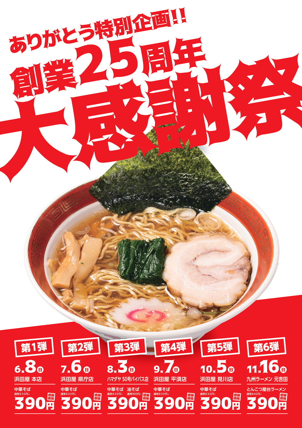 平素より、浜田屋グループ各店をご利用いただきまして誠にありがとうございます。 おかげさまで、創業25周年を迎えることが出来ました。 日頃の感謝を込めて、6月から各店舗1日限定で創業25周年大感謝祭を開催します!! 日程につきましては、掲載画像をご確認下さい♪ スタッフ一同、皆様のご来店をお待ちしております。